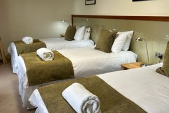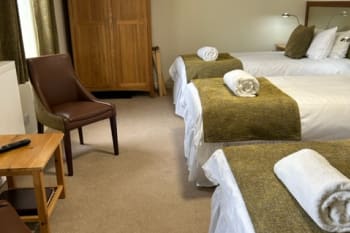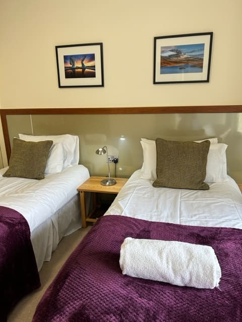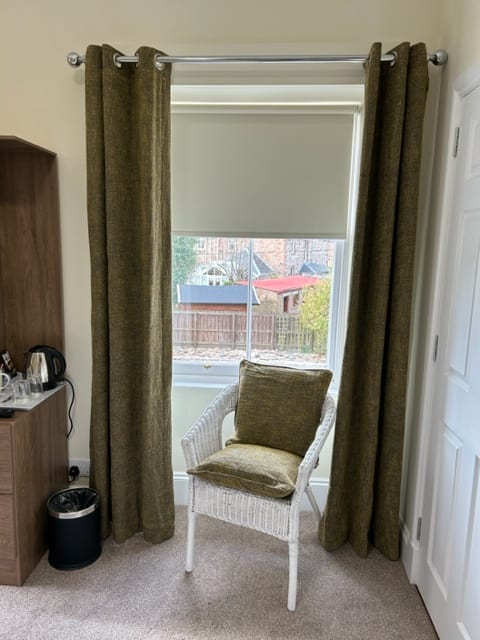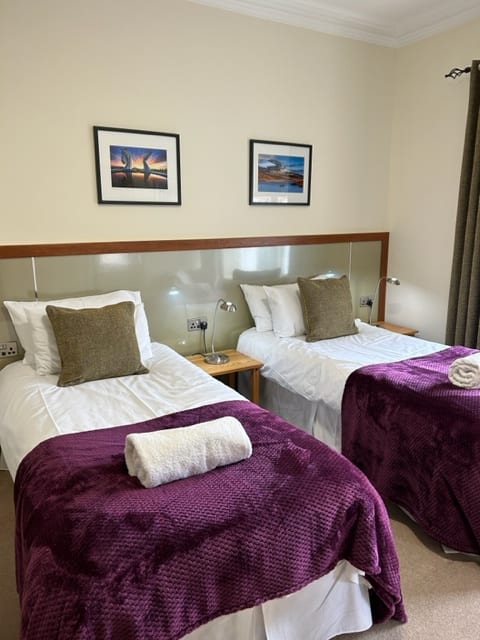 This spacious Twin bedroom ( 2 single beds) offers superb comfort and modern furnishings. It has a superb powerful shower and enjoys a view over the front garden. There are two seperate single beds. We also put the two beds together to form a Super King bed. Please note the beds will remain as seperate beds and will have seperate linen.