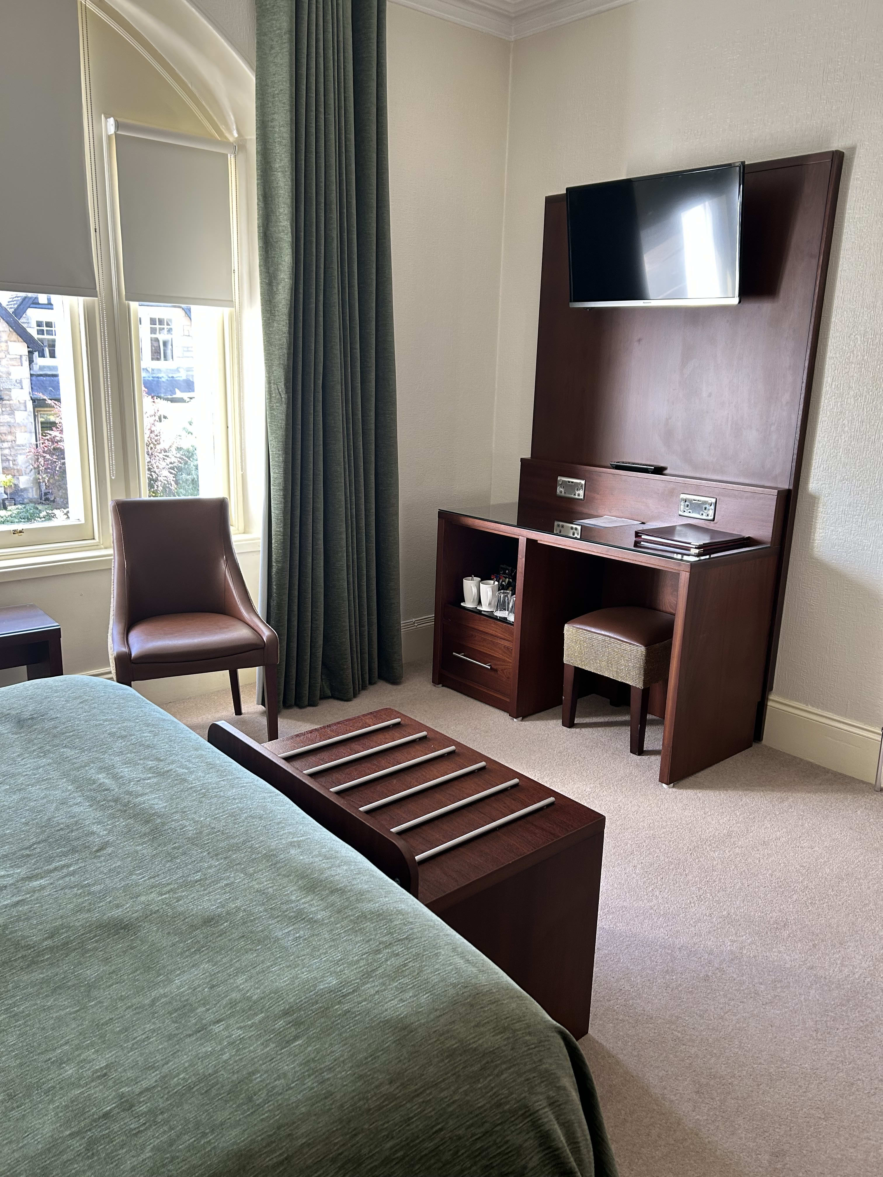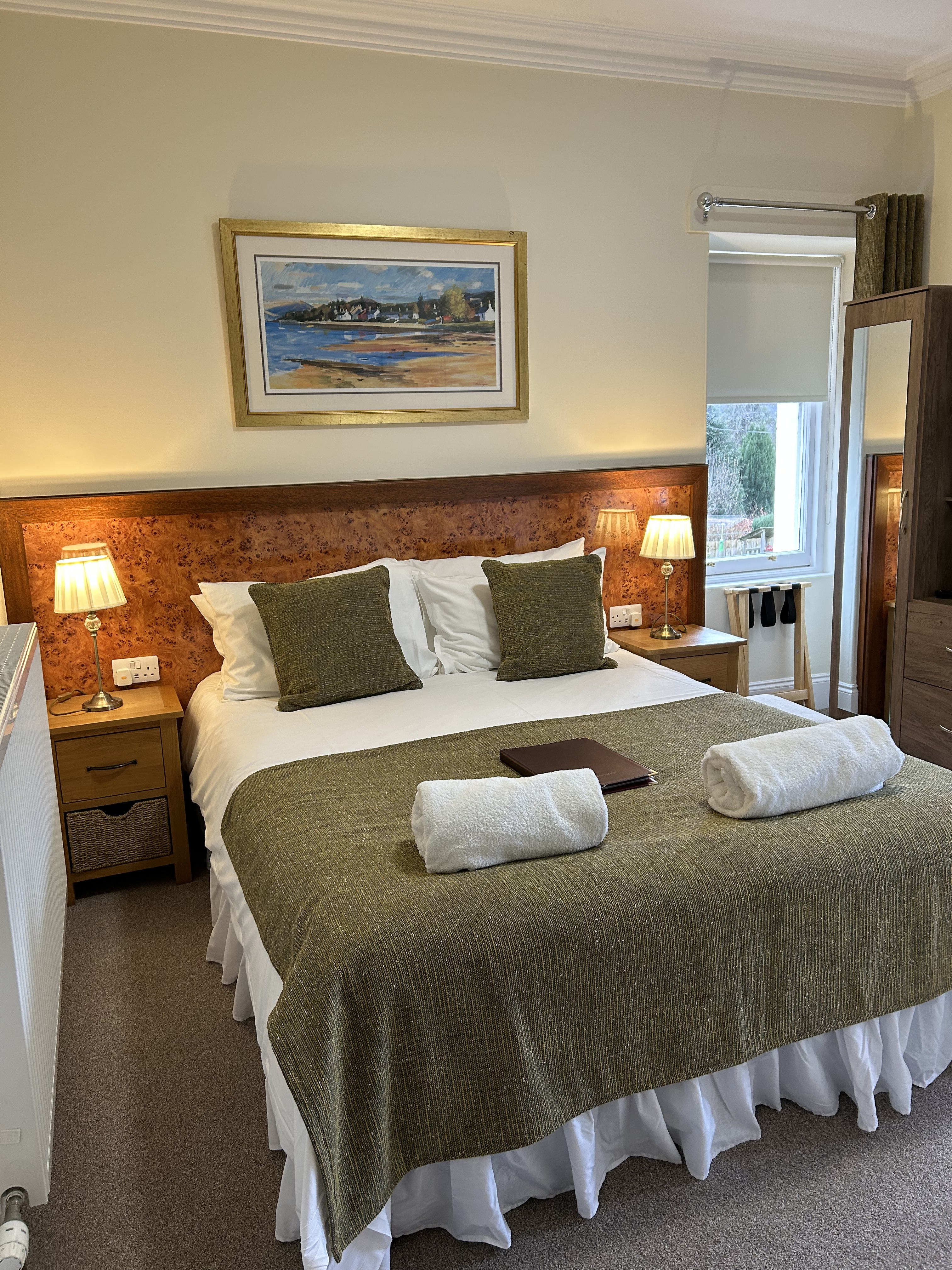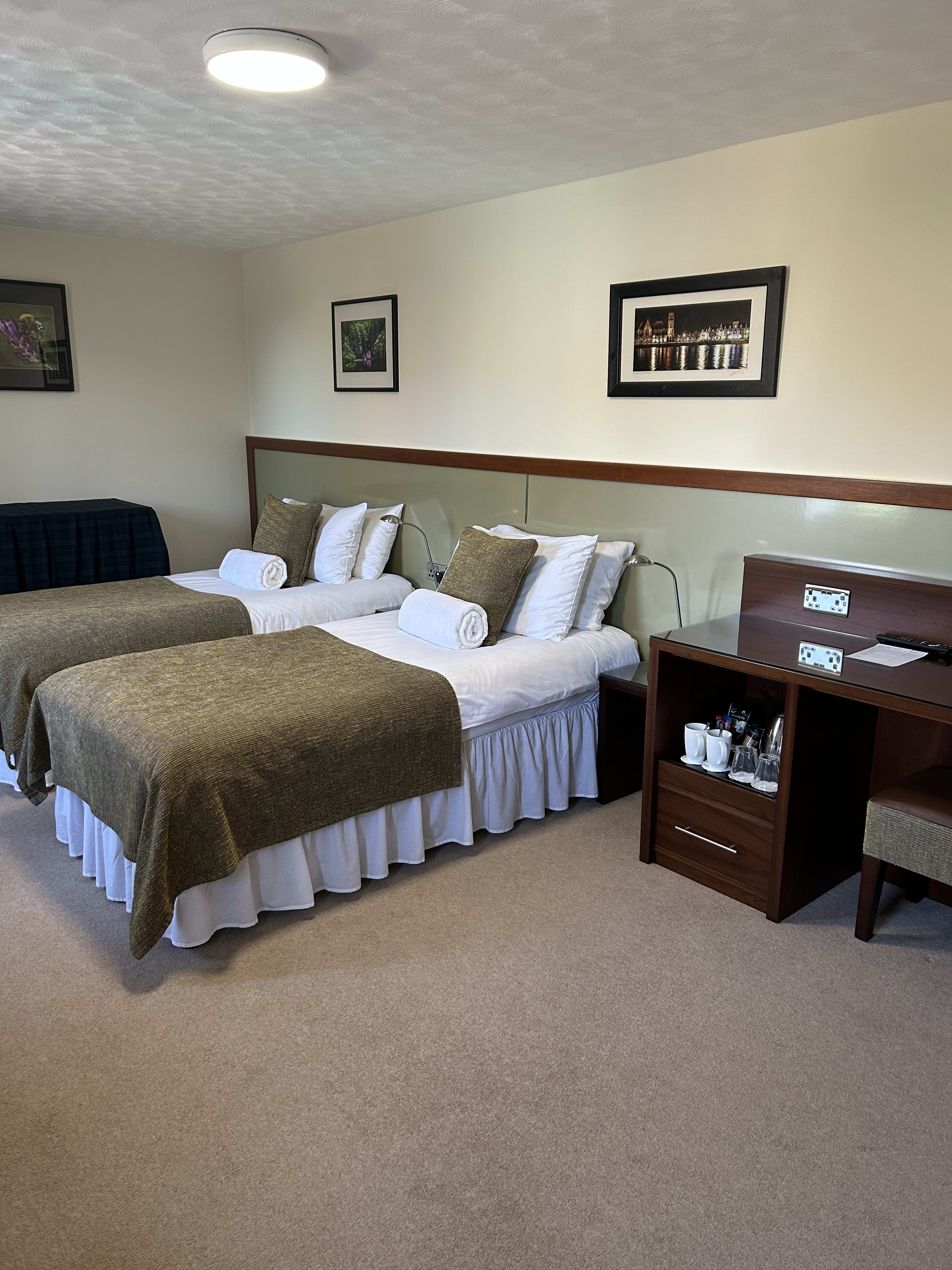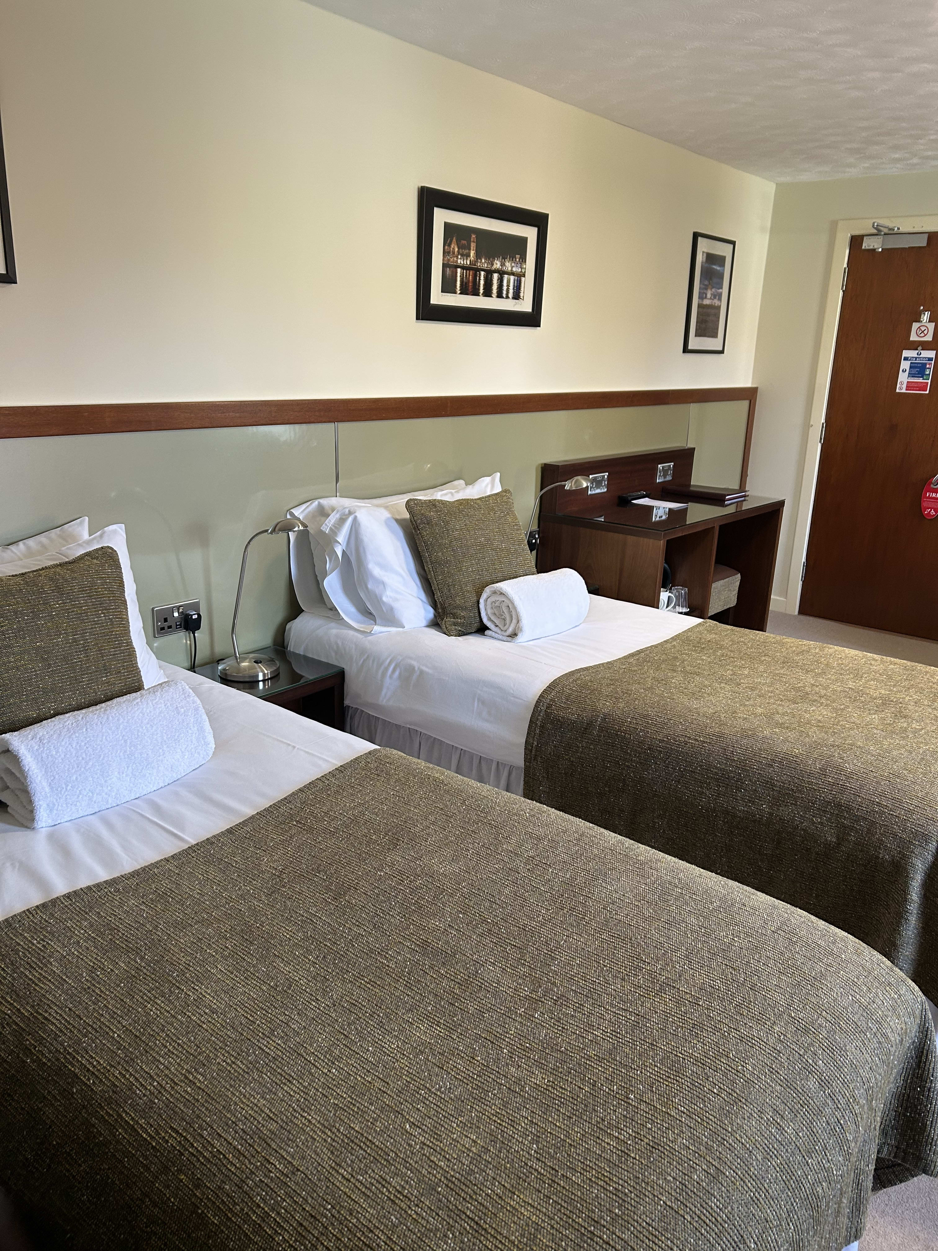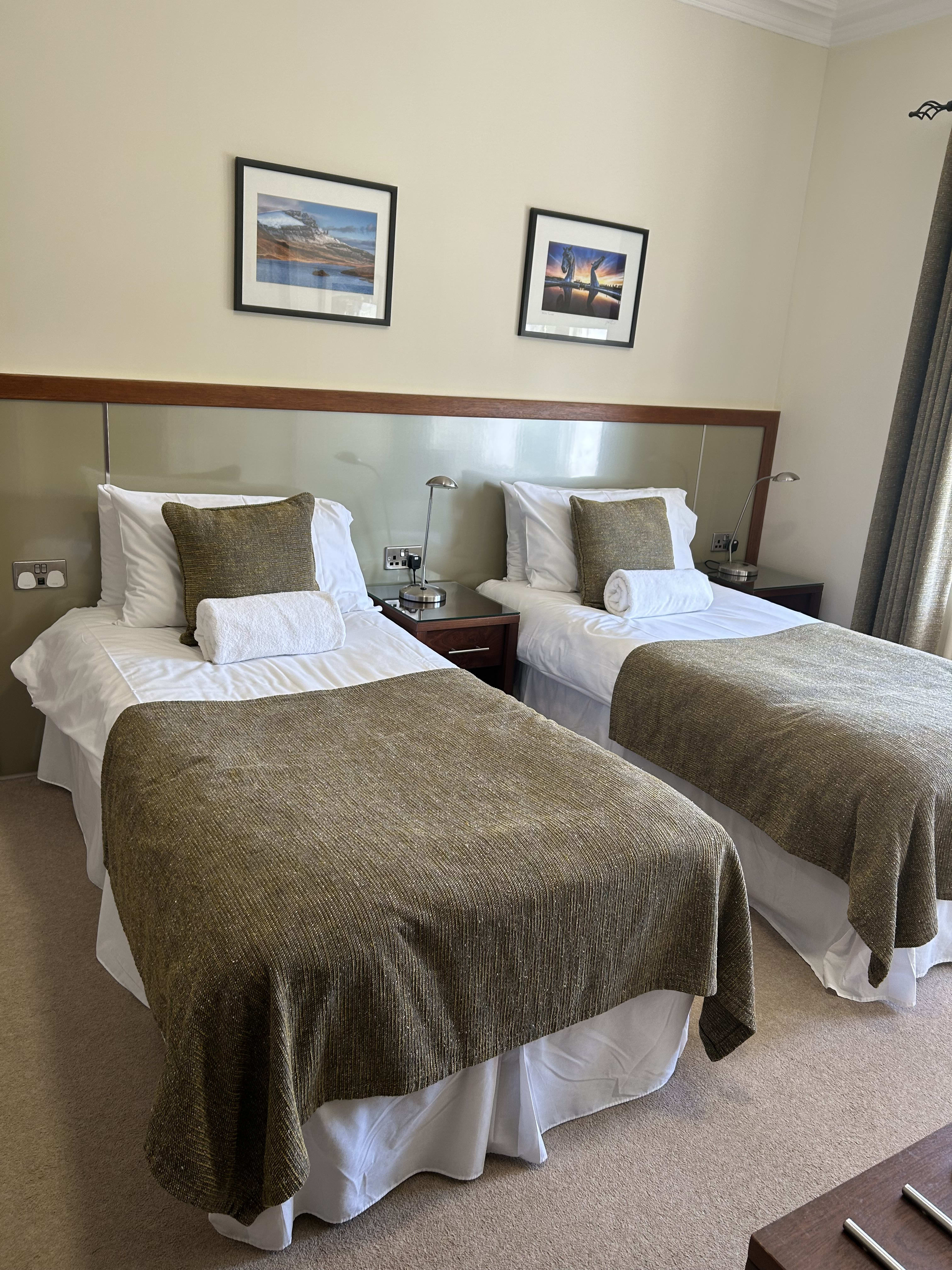 This spacious Twin bedroom (2 single beds) offers superb comfort and modern furnishings. There is the added touch of putting 2 beds together to make a Super king bed. Please note that these beds with remain separate beds with separate linen.